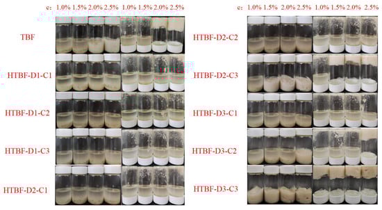 In this study, MCT-based Pickering HIPEs based on TBF and HTBF were constructed under the conditions of φ = 80% and c = 1.0–2.5% (Figure 5). TBF could only fabricate stable Pickering HIPEs at c = 2.0% and 2.5%; HTBF-D2-C3 could stabilize Pickering HIPEs at c = 1.5%, 2.0%, and 2.5%; and HTBF-D3-C3 could construct Pickering HIPEs at c = 1.0–2.5%. This indicated the ranking of emulsifying ability as HTBF-D3-C3 > HTBF-D2-C3 > TBF, which was consistent with the results of the contact angle and interfacial tension assays. Fonseca-Florido et al., also observed that hydrochloric acid could enhance the emulsifying capacity of wax cassava starch [31].