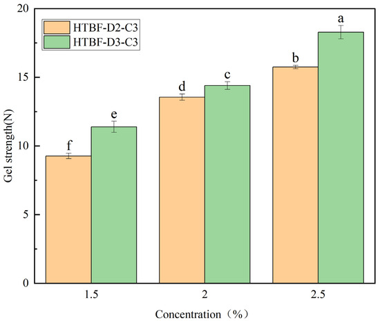 The gel strength of the Pickering emulsions developed by HTBF-D2-C3 and HTBF-D3-C3 at φ = 80% and c = 1.5, 2.0, and 2.5% (different letters in the same figure indicate significant differences (p < 0.05)).