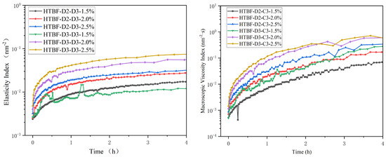 Pickering HIPEs were obtained with HTBF-D2-C3 and HTBF-D3-C3 as emulsifiers at c = 1.5, 2.0, and 2.5% and φ = 80%. The 20 mL newly prepared Pickering HIPEs were placed into the Rheolaser LAB6 microrheological analyzer (Formulation, France), and the evolution of the macroscopic viscosity index (MVI) and the elastic index (EI) over time were recorded [23].
