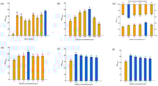 Optimization of medium ingredients via SFD. (a) Type of basic culture medium, (b) glucose concentration, (c) peptone concentration and yeast extract concentration, (d) KH2PO4 concentration, (e) MgSO4 concentration, (f) CuSO4 concentration. The same letters in a column indicate that the data do not differ significantly at 5% probability using Tukey’s test. The blue bar means better conditions for the growth of S. fibuligera Y1402.