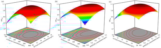 Variance analysis revealed that various factors influence yeast Y1402 growth in the following order: KH2PO4 concentration, glucose concentration, and yeast extract concentration. Primary terms A and C are extremely significant (p < 0.01), while primary term B is not significant. Additionally, A2, B2, and C2 have extremely significant curve effects on the growth of yeast Y1402. There are also significant interactions between glucose concentration and KH2PO4 concentration, as well as between yeast extract concentration and KH2PO4 concentration. However, the interaction between glucose concentration and yeast extract concentration is not significant. We used the regression equation to generate response surface plots (Figure 2) to demonstrate the interplay between the various factors visually. As shown in Figure 2a, cell density first increases and then decreases as glucose or yeast extract concentration increases. The optimal growth conditions for yeast Y1402 occur when the glucose concentration is 360.61 g/L and the yeast extract concentration is 14.65 g/L. Similarly, Figure 2b demonstrates that cell density also exhibits a trend of increasing and then decreasing as glucose concentration or KH2PO4 concentration increases. The optimal growth conditions for yeast Y1402 are achieved when the glucose concentration is 360.61 g/L and KH2PO4 concentration is 5.49 g/L. Finally, Figure 2c indicates that cell density also follows a trend of increasing and then decreasing as yeast extract concentration or KH2PO4 concentration increases. The highest cell density is achieved when the yeast extract concentration is 14.65 g/L and KH2PO4 concentration is 5.49 g/L. By solving this equation using Design-Expert software, the optimal culture medium for the growth of yeast Y1402 was determined to have glucose, yeast extract, and KH2PO4 concentrations of 360.61 g/L, 14.65 g/L, and 5.49 g/L, respectively. In this optimized medium, the cell density of S. fibuligera Y1402, measured as OD560nm, was found to be 53.95, which was very close to the predicted value of 53.75. The cell density in the optimized medium was improved by 20% compared to the highest level achieved with SFD (OD560nm = 44.90).