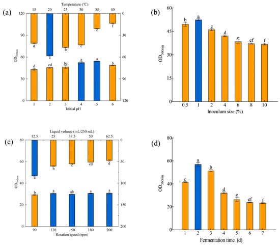 Optimization of fermentation conditions by SFD: (a) Initial pH and fermentation temperature, (b) inoculum size, (c) rotation speed and liquid volume, (d) fermentation time. The same letters in a column indicate that the data do not differ significantly at 5% probability using Tukey’s test. The blue bar means better conditions for the growth of S. fibuligera Y1402.