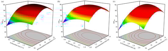 Based on the results of the SAT, a Box–Behnken experiment with three factors (inoculum size (X1), fermentation temperature (X2), and fermentation time (X3)) at three levels was used for the RSA, and the results are shown in Table 8. Design-Expert software was used to process the experimental results, and the quadratic regression equation between the cell density of S. fibuligera Y1402 and the three factors was as follows: