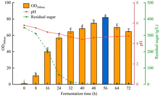Using the optimized medium ingredients and fermentation conditions, scaled-up fermentation of S. fibuligera Y1402 was conducted in a 3 L fermenter. A fermentation cycle of 72 h was used, with samples taken every 8 h to measure the cell density, pH, and residual sugar concentration in the medium. The growth curve of S. fibuligera Y1402 and the change in residual sugar concentration can be seen in Figure 5.