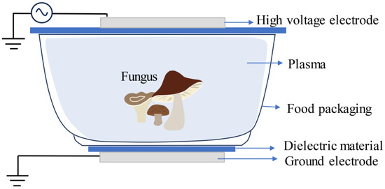 The food industry is actively seeking new non-thermal food processing technologies [78]. In recent years, cold plasma (CP) treatment has attracted considerable attention as a novel cold sterilization and preservation technology [79]. Plasma is the fourth state of matter in nature, generated by the decomposition of air by high-energy electrons [78,80]. In the preservation of edible mushrooms, dielectric barrier discharge (DBD) is the most effective method for producing CP [81]. The key lies in sealing the product and gas inside the packaging, generating a strong electric field under external electrode action, ionizing the gas inside the packaging, and forming sterilizing plasma (Figure 2) [82]. In a study, when 30% hydrogen peroxide steam (flow rate of 0.47 mL/min) and argon (4.24 L/min) were used as working gases, DBD treatment prolonged the storage period of A. bisporus by inhibiting enzymatic browning and inactivating Pseudomonas [12]. In another study, when air was used as the working gas, DBD treatment effectively inhibited microbial growth and reproduction while reducing browning reactions and oxidative damage, thus maintaining the color and texture of F. velutipes [83]. A research team conducted a comparative analysis of the effects of DBD treatment and direct cold plasma treatment on the physicochemical properties and shelf-life of A. bisporus [84]. The results showed that DBD treatment was more effective in inhibiting the total number of bacteria, yeast, and mold while also resulting in lower browning value and better quality characteristics of the mushrooms.