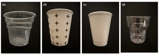 In the study, four plastic cups, namely PS, PE-coated paper cups, EPS and PP (Figure 1), that are frequently used as single-use beverage containers were purchased from a local retailer in Istanbul, Turkiye between 03/2022 and 04/2023, and the brand, serial number and purchase date of all cups was recorded. The volumes of the selected cups were 200–300 mL. The thickness of the cups was measured using a digital micrometer (Mitutoyo, Kawasaki, Japan). According to the measurement results; EPS: 1880 µm ± 0.005, PP and PE: 350 µm ± 0.01, PE-coated paper cup (PE thickness): 200 µm ± 0.01, PS: 850 µm ± 0.01.
