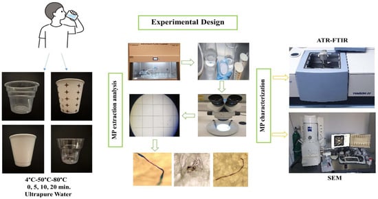 In this study, real-use conditions of the disposable plastic cups were mimicked by applying water at different temperatures (4 °C, 50 °C and 80 °C) [44] and exposed for different times (0, 5, 10 and 20 min) [32,33]. The experimental procedure is schematized in Figure 2. Firstly, all plastic containers were rinsed with ultrapure water at room temperature (~25 °C) and dried at ambient temperature prior to the experiment. Unrinsed cups were also tested for the determination of the pre-rinsing effect. Ultrapure water (50 mL) at 4 °C, 50 °C or 80 °C was dispensed to the cups and held for 0, 5, 10 and 20 min at room temperature. In total, 50 mL of ultrapure water filled 20–27% of the plastic cups. At each time interval, water samples in an individual cup were removed for MP sampling. Standard filtration techniques were applied to determine the amount of MPs released from the plastic cups. All the samples were filtered through a sterile nitrocellulose membrane filter (0.45 µm pore size, Filter Bio, China) using a vacuum filtration set (Isolab, Eschau, Germany). In the preliminary studies, the filter was stained with Rose Bengal (200 mg/L) in order to determine the possible contamination of natural organic particles [27]. After leaving the filters for 5 min for reaction, they were washed with ultrapure water and the stain was drained. Non-stained particles were referred to as MPs during the microscopic evaluation because Rose Bengal, a biological origin stain, could bind to only non-synthetic materials [45]. After filtration, the filters were stored in pre-cleaned glass petri dishes at room temperature for further analysis. All the experiments were performed in triplicate.