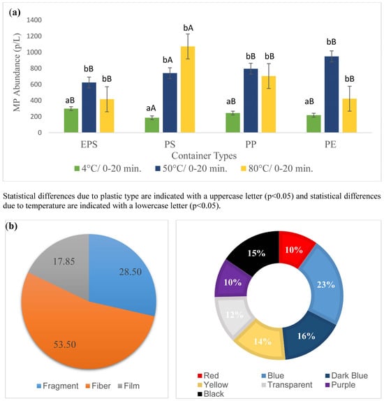 The effect of the different temperatures and exposure times on the MPs transferred into the water was analyzed, and the results are shown in Figure 3. The average MP transfer observed in all experiments was 556.80 ± 31.39 particles/L (p/L). The lowest and highest MP numbers were 126.6 ± 75.71 p/L and 1420 ± 380 p/L at 4 °C for 0 min in PE-coated paper cups and 50 °C for 20 min in PP cups, respectively. Figure 3 shows the average MP release depending on temperature and time, mean quantity of MPs exposed during the consumption period, MP color and shape and decrease in the number of MP particles during washing, respectively. In terms of the type of plastic, the minimum and maximum MP values were 153 ± 30.55 − 1360 ± 363.8 p/L in PS cups, 160 ± 20 − 1420 ± 380 p/L in PP cups, 126 ± 75.71 − 1346 ± 473.84 p/L in PE-coated paper cups and 246 ± 100.66 − 720 ± 393.95 p/L in EPS cups, respectively. All the analyses showed that the use of plastic cups containing water at different temperatures had a statistically significant effect on the release of MPs. As seen in the figure, MP release increased with the increasing temperature. MPs released at 50 °C and 80 °C were significantly (p < 0.05) higher than those of 4 °C. Considering 50 °C and 80 °C, the number of particles was not significantly (p > 0.05) different. The effect of exposure time on MP release was not also statistically significant (p > 0.05). The release of MPs from PS cups was found to be statistically significant compared to PP, PE and EPS cups (p < 0.05). In previous studies examining MPs released from different plastic food packaging materials, a higher MP release was found in PS packaging than in HDPE bags, PP takeaway cups and PP, PE and PET containers [5,32]. This supports the idea that PS cups could pose a high MP risk by hot and cold beverage consumption compared to other plastic cups. The number of MPs transferred to the water with the increasing temperature revealed were generally higher independently from the type of plastic cups (Figure 3a). In one study, in which 5 °C and 60 °C temperature application was investigated in three different plastics types, as similar to our findings, water temperature at 60 °C caused a higher MP release in the PP and PE-coated cups compared to at 5 °C [38]. This could be due to the increase in the deformation rate on the surface of the plastic material with the increasing water temperature, which increases the tendency of MP release.