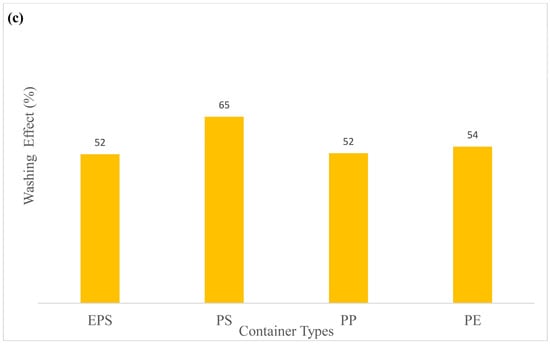In this study, it was found that the pre-washing treatment reduced the MP number by 52–65% (Figure 3c). Therefore, it could be speculated that washing the disposable plastic cups with water before use could reduce the level of MPs transferred into the beverage. The average MP values after pre-washing the PS, PP, EPS and PE-coated paper cups exposed to water at different temperatures and times were 667.22 p/L, 582.22 p/L, 530.55 p/L and 447.22 p/L, respectively. Similarly, Chen et al. [49] found varying levels of MPs released in different types of plastic cups in water. This variation might be due to several reasons such as different water contact areas and water levels in the cups, varying plastic types and their properties originating from different processing conditions [32,49].