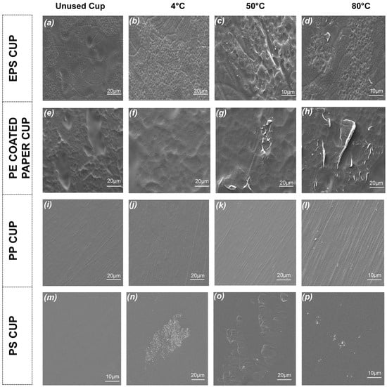 According to the SEM results, unused PP (Figure 4i–l) and PS (Figure 4m–p) cups had smoother, more uniform and dense surfaces. With the increasing temperature, porous structures and deformation were observed, especially on the surface of PS and PP cups which were smoother before use. The higher MP release from the PS and PP cups at 80 °C also supports the literature findings. Similarly, Chen et al. [49] reported that the subjection of the PP and PS cups to water at 95 °C for 20 min caused more deformation on the inner surface of the cups than subjection temperatures of 10 °C, 40 °C or 70 °C.