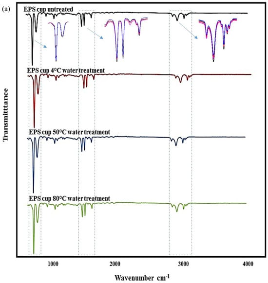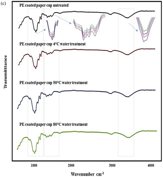 In the case of the PP cups, peaks belonging to C-H stretching were observed in the 2950–2838 cm−1 region, while CH2 vibrations were observed at the wavelength of 1455 cm−1. In addition, 1377 cm−1 represented CH3 bands, and all reference peaks of the polymer (C-CH3 band, C-C band, C-C stretch) were observed in the range of 808–1166 cm−1 region. In the case of the PS and EPS cups, all the peaks, called fingerprints, of the polymers were observed. These characteristic peaks are a 3024 cm−1 region, aromatic C-H stretches, 1492–1601 cm−1 aromatic ring structure stretches, 1027 cm−1 aromatic CH band, the 756 cm−1 peak is the CH band and 694 cm−1 is the largest peak of the ring structure other than the aromatic CH band [54]. When the FTIR spectrum of the PE-coated paper cup is examined, asymmetric/symmetric CH2 stretching was observed in the range of 2916–2850 cm−1, while 3334 cm−1 and 1426 cm−1 CH2 bands were the characteristic peaks belonging to the cellulose on the outer part of the paper cup [46,55]. The observation of all the peaks mentioned in the cups at all temperature levels was the expression that there was no chemical change on the inner surface of the cup. Similarly, Zhou, Wu, Tang, Chen, Cheng, Wei, Ma and Liu [38] reported that different temperature applications did not cause any chemical changes on the inner surface of the PP, PET and PE plastic cups. On the other hand, the characterization of MPs by FTIR is not completely possible due to releasing other additives such as colorants, chemicals and fluorescent compounds, altering the polymer spectra and, therefore, preventing comparisons with the chemical library databases [5].