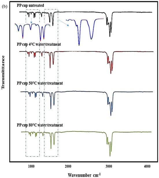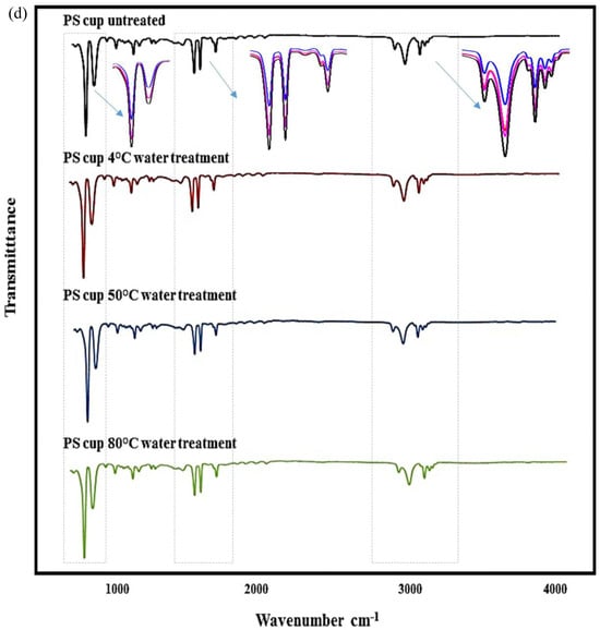 The water-treated and untreated cups were analyzed using ATR-FTIR to characterize the molecular structure of their surface. In Figure 5, the reference peaks for the respective plastic cups were compared, and their characteristic peaks are shown on the spectra. The type of cups was verified using FTIR analysis concluding high similarity (<99.9%) with the respective plastics present in the OPUS spectral library. As seen in the figure, plastic cups exhibited similar spectra as a result of water exposure at different temperatures. However, the intensities of the peaks at some wavelengths decreased with the increasing temperature, which demonstrates the deformation of the plastic resin constituents. Abrasion of the inner surfaces of the plastic containers using heat treatment (surface erosion) may cause a decrease in IR beam intensity. The observed change in absorption peaks can be attributed to the possible degradation of chemical bonds on the plastic surface, while electrochemical factors and the applied temperatures can be associated with changes in the layer structure of the polymer surface [37,53].