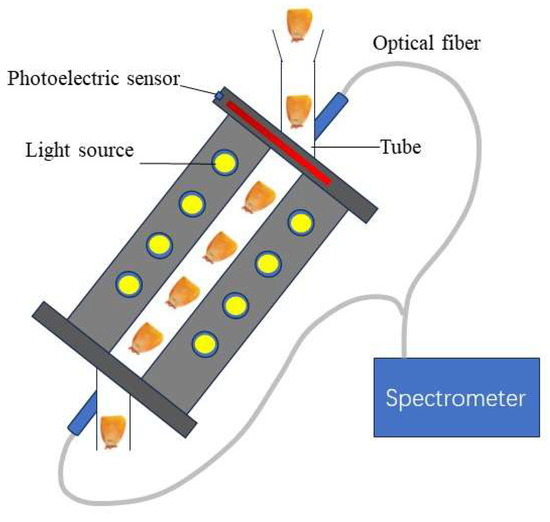 The NIR spectra were collected using an on-line spectra acquisition device (Ambrose, 2016) (Figure 1). The on-line NIR spectra acquisition device was composed of five parts: an optical fiber, a photoelectric sensor, a light source, a glass tube, and a spectrometer (Ocean optics, Orlando, FL, USA, NIR QUEST, spectra range of 899–1715 nm). The specific process of data collection is described as follows: a single seed triggers the photoelectric sensor as it slides down the tube, which then sends a signal to the spectrometer to collect a spectrum (Sraw) using a specific integration time. The spectrum is collected as the kernel travels down the tube and is displayed and stored in the host computer. Data collection is carried out through a preset integration time. The integration time in the preliminary experiment was set to 100 ms after many attempts.