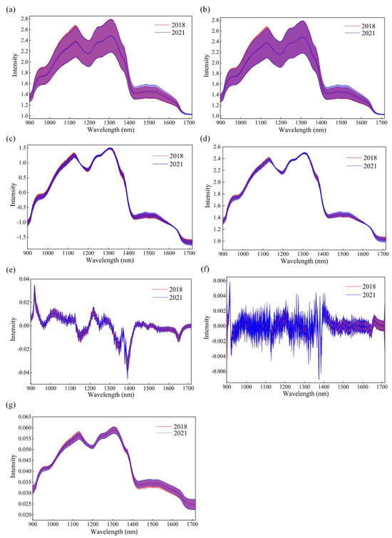 The average spectra (solid line) with their standard deviation (shadow region). (a) The original spectra curves; (b–g) stand for the spectra preprocessed by SGS, SNV, MSC, SG-D1, SG-D2, and Norm.