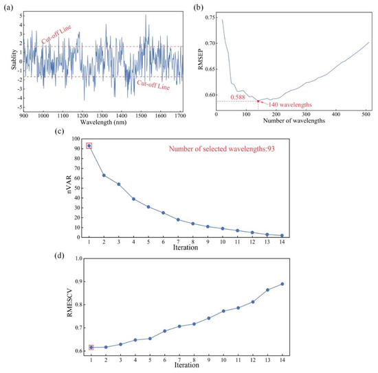 As discussed in Section 3.4, MC-UVE-BOSS, a combination of MC-UVE and BOSS, was an effective wavelength selection method in the identification of maize seeds from different harvest years. Figure 3 shows the wavelength selection process of the MC-UVE-BOSS method. In the process of MC-UVE, 320 samples in the training set were applied as the input for the MC-UVE algorithm for selecting effective wavelengths. The stability of each wavelength was calculated and is shown in Figure 3a. The absolute values of stability were sorted in a descending manner. A number (N) of the variables were then selected from the sorted stabilities as informative wavelengths, corresponding to the stability of the Nth variable as the cutoff value. As the N increased from 20 to 500 with a step of 20, a set of PLS models were developed and applied to the prediction set, followed by the calculation of RMSEP values. Figure 3b represents the RMSEP variation of the PLS calibration model with the increase in the number of variables. It can be seen that the lowest RMSEP value was acquired when the number of the selected wavelengths was 140, corresponding to the wavelength’s stability outside the cut-off line (Figure 3a, red dotted line).