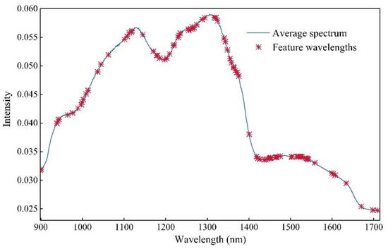 After wavelength selection by the MC-UVE method, the BOSS method was used to further extract effective information. In the process of BOSS, 140 wavelengths selected by MC-UVE were used to generate a large number of subsets in variable space, which were used to build PLS sub-models. The sub-models with a smaller RMSECV were extracted (10%), obtaining the regression coefficients and then new weights for the variables. Based on the new weights, a weighted bootstrap sampling (WBS) method was used to generate a new subset. The number of selected variables decreased gradually and reached 1 after 14 iterations (Figure 3c). Meanwhile, the RMSECV in the sub-models increased during the iterations. It can be seen that the minimum RMSECV value was obtained at the first iteration, with the number of selected wavelengths of 93. The wavelengths selected by MC-UVE-BOSS were mainly located at 1000–1020, 1260–1300, 1420–1480, and 1500–1520 nm (Figure 4). The wavelengths near 1200 nm were associated with the attributes of the secondary stretching vibration of C–H bonds in starch, proteins, or lipids [40]. The selected wavelengths around 1400–1500 nm were the absorption wavelengths of the first overtone of O-H and N-H stretching, which were related to the water and protein contents of maize seeds [41]. The wavelengths near 1700 nm were relevant to the absorption wavelength of the first overtone of C-H, which was caused by the strong absorption of fatty acids contained in the maize kernels [42]. This indicates that the selected wavelengths contain rich information related to the nutritional composition of maize seeds.