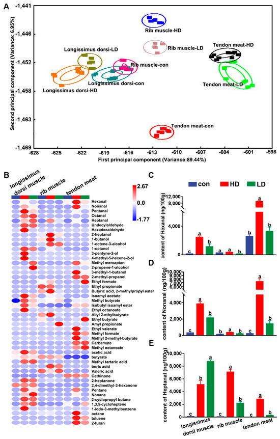 The effect of dark muscle on the odor and flavor substances of Holland mini-piglet pork. (A). Odor profile of meat. (B). Forty-eight flavor substances after dark muscle treatment in pork were obtained using GC-MS. (C–E). Distribution of three main flavor substances in each group. Different letters indicated significant differences among group at p < 0.05.