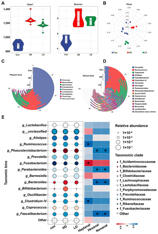 The effect of dark muscle on gut microbiota. (A). The alpha diversity of the gut microbiota in three groups. (B). Variations in the gut microbiota structures of pigs treated with dark muscle via weighted UniFrac PCoA. (C). RDP classifications of microbial composition at the phylum level and genus level. (D). After tuna dark muscle treatment, sixteen genera with high abundance in the gut microbiota were obtained. The larger the circle in the bubble chart is, the higher the abundance. (E). Spearman’s correlation analysis of 16 genera with hexanal and nonanal. Red indicates a negative correlation, and blue indicates a positive correlation. * p < 0.05.
