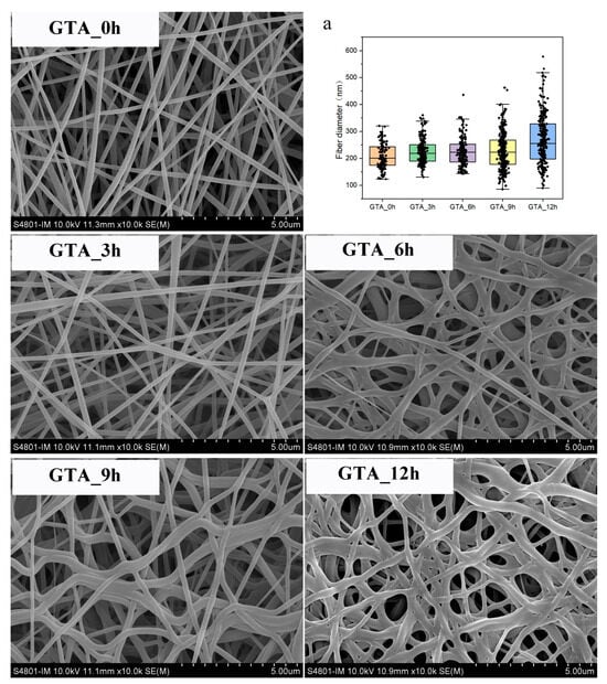 The morphology and fiber diameter distribution of the non-crosslinked and crosslinked zein nanofibers are shown in Figure 1 and Table S1. According to Figure 1a, the average fiber diameter of GTA_0h was measured as 208.22 ± 46.93 nm; the average fiber diameters of GTA_3h, GTA_6h, GTA_9h, and GTA_12h were calculated as 225.52 ± 47.25 nm, 224.32 ± 52.93 nm, 226.96 ± 68.00 nm, and 267.69 ± 90.97 nm, respectively. The average fiber diameter and diameter distribution slightly increased with increasing exposure time to GTA vapor. The SEM images show that the fibers of GTA_0h were continuous and uniform. After crosslinking with GTA vapor, the fibers swelled but retained their fiber morphology, which is considered to be related to the absorption of water vapor during exposure to GTA vapors [35]. These results are consistent with those of previous studies, in which the fiber diameter of electrospun nanofibers increased after vapor-phase GTA crosslinking [35,52].