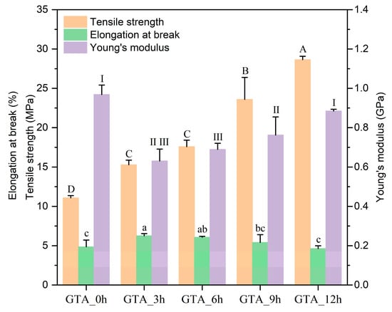 The mechanical properties of the non-crosslinked and crosslinked zein nanofibers are presented in Figure 2. The results indicated that GTA_0h showed minimal TS (11.08 ± 0.29 MPa). After crosslinking, the TS was observed to increase, with values of 15.28 ± 0.58 MPa, 17.59 ± 0.83 MPa, 23.60 ± 2.79 MPa, and 28.65 ± 0.43 MPa for GTA_3h, GTA_6h, GTA_9h, and GTA_12h, respectively. This increase might be due to the formation of chemical bonds among zein molecules inside and among the fibers, resulting from crosslinking during exposure to GTA vapors [35,53]. The longer crosslinking time would allow the generation of a denser network structure, improving the mechanical strength of the zein nanofibers. On the other hand, the YM of GTA-3h was 0.63 ± 0.06 GPa; after 12 h of vapor-phase GTA crosslinking, the YM value gradually increased to 0.88 ± 0.01 GPa, indicating that the zein nanofibers showed increased resistance to deformation with an increase in the crosslinking time. Notably, compared with the crosslinked zein nanofibers, GTA-0h had the most considerable YM value of 0.97 ± 0.05 GPa. These findings demonstrate that crosslinking decreases the rigidity of electrospun zein nanofibers. In addition, the EB increased continuously from 4.85 ± 0.86% of GTA-0h to 6.07 ± 0.12% of GTA-6h and then slightly decreased to 4.63 ± 0.36% of GTA-12h. One possible reason for this is that after 6 h of GTA crosslinking, the strong bond or three-dimensional structure formed between zein and GTA molecules would restrict the motion of the molecular chains [54,55]. Chen et al. (2022) fabricated electrospun feather keratin/gelatin nanofibers crosslinked by vapor-phase GTA and found that proper crosslinking could effectively enhance their mechanical strength [31]. Wang et al. (2016) also reported that the TS value of electrospun starch nanofibers was increased by ~10 times via crosslinking with vapor-phase GTA [52].