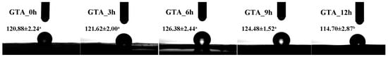 The WCA was used to investigate the surface hydrophilicity of the zein nanofibers before and after vapor-phase GTA crosslinking. The surface of nanofibers is considered hydrophobic when θ > 90°; on the contrary, it is considered a hydrophilic surface [56]. As shown in Figure 3, GTA_0h had a WCA of 120.88 ± 2.24°, indicating a hydrophobic surface. When the exposure time to GTA vapors was shorter than 9 h, the WCA values increased with exposure time. The WCA of GTA_6h was 126.38 ± 2.44°. This increased hydrophobicity can be attributed to the consumption of hydrophilic groups in zein molecules during crosslinking and the decrease in porosity of the crosslinked zein nanofibers, which restricted water penetration [31,55]. However, no significant difference in the WCA of the zein nanofibers was observed until the crosslinking time reached up to 12 h. After 12 h of vapor-phase GTA crosslinking, the WCA of the zein nanofibers decreased to 114.70 ± 2.87°, which may be related to their decrease in surface roughness and thickness. Notably, GTA_12h still possessed a hydrophobic surface (θ > 90°).