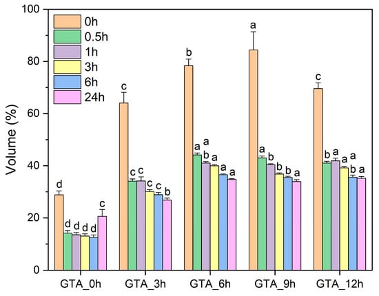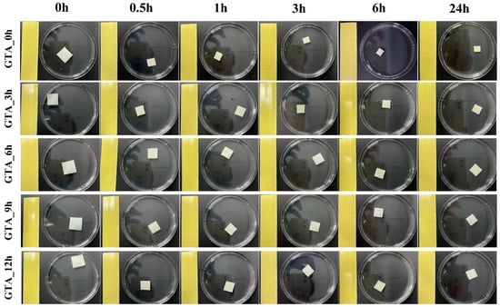 As a hydrophobic protein macromolecule, zein is insoluble in water. To examine the water resistance of the electrospun zein nanofiber samples, we used distilled water to immerse the as-spun and crosslinked zein nanofibers. Figure 4 and Figure 5 separately show the macroscopic images and the volume of non-crosslinked and crosslinked zein nanofibers after 24 h of immersion. GTA_0h was observed to shrink immediately when in contact with water, with a volume of 59.37% of the initial value. In comparison, the crosslinked zein nanofibers possessed better water resistance, with volumes of 64.07% (GTA_3h), 78.36% (GTA_6h), 84.39% (GTA_9h), and 69.58% (GTA_12h) upon exposure to water. When the immersion time was increased to 24 h, a decrease in the volumes of all samples was observed. The volumes of GTA_3h, GTA_6h, GTA_9h, and GTA_12h were 26.80%, 34.73%, 33.90%, and 35.17% of their original values, respectively, which is still higher than that of GTA_0h (28.34%). Furthermore, Figure S1 shows the macroscopic images of non-crosslinked and crosslinked zein nanofibers upon immersion in acetic acid. GTA_0h was found to be fully dissolved in acetic acid. The crosslinked samples could better retain their integrity without dissolution. These results indicate that vapor-phase GTA crosslinking could improve the resistance of zein nanofibers to water and acetic acid. Yu et al. (2020) reported similar results, in that the moisture resistance of zein/PVA nanofibers was greatly enhanced after steam crosslinking with GTA [57]. Moreover, Selling et al. (2008) reported that in-site GTA-crosslinked zein nanofibers could dissolve in acetic acid [58]. The different results may be related to the difference in crosslinking methods and the amount of GTA used.