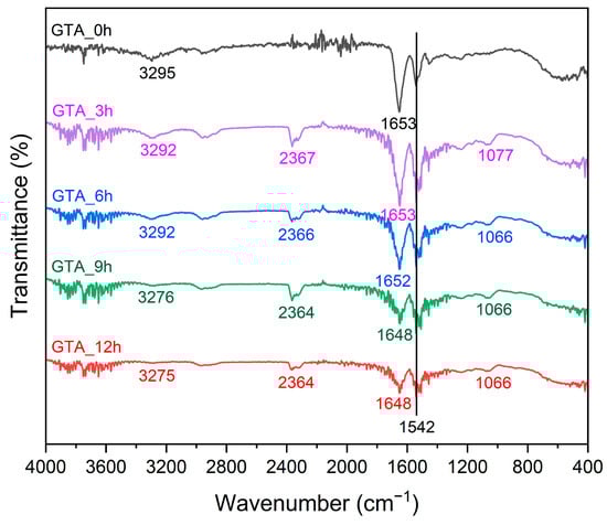 The FT-IR spectra were recorded to explore the structural changes in the zein nanofibers before and after crosslinking with GTA vapors. As shown in Figure 6 and Table S2, the spectra of GTA_0h presented a broad characteristic peak at 3295 cm−1, corresponding to the O–H and N–H stretching vibrations [59]. As the crosslinking time increased, that peak exhibited a redshift, and its peak intensity gradually decreased, suggesting the success of the crosslinking reaction. The free amino groups in the fibers reacted with the aldehyde groups in GTA molecules, leading to fewer free amino groups remaining to form O–H and N–H hydrogen bonds [60]. Chen et al. (2022) also reported similar results in electrospun feather keratin/gelatin nanofibers crosslinked by GTA vapors [31]. In addition, with increasing crosslinking time, the characteristic peaks representing the C=O stretching vibration, C–N stretching vibration, and N–H bending vibration (amide I band) were red-shifted from 1653 cm−1 of GTA_0h to 1648 cm−1 of GTA_12h [61,62]. The ATR-FT-IR spectra of all nanofiber samples showed the maximum amide II band at 1542 cm−1. After crosslinking, the characteristic maximum of the amide I/amide II bands shifted to lower frequencies from 1653 cm−1/1542 cm−1 of GTA_0h to 1648 cm−1/1542 cm−1 of GTA_12h. These results reflect the change in random coil structures, indicating the greater structural stability of crosslinked zein nanofibers than GTA_0h [63]. For the crosslinked zein nanofibers, a new characteristic peak appeared at ~1066 cm−1, corresponding to the symmetric stretching vibration of the C=O groups [64]. These findings confirm the crosslinking of zein nanofibers by GTA vapors. Overall, the crosslinked zein nanofibers showed secondary structures similar to those of as-spun zein nanofibers, suggesting that crosslinking post-treatment by GTA vapors on zein nanofibers had little effect on their secondary structure.