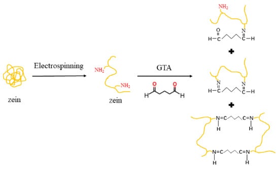 Figure 7 presents the possible molecular structure of zein after electrospinning and crosslinking. Acetic acid is a weak organic acid that is capable of breaking hydrophobic interactions, unfolding the β-sheet structure, and causing partial denaturation of the α-helix structure of proteins [65,66]. Zein was demonstrated to dissolve in acetic acid, with positive charges and a highly extended structure [66]. More free amino groups in the protonated zein molecules were exposed after electrospinning because of the rapid and large proportion of stretching. Moreover, fast solvent evaporation caused rapid solidification of the fibers, leading to free amino groups in zein being distributed on both sides of the molecular chains [52]. During exposure to GTA vapors, free amino groups were allowed to react with aldehyde groups in GTA molecules to form chemical bonds, which resulted in increased mechanical strength and water resistance of the crosslinked zein nanofibers [17].