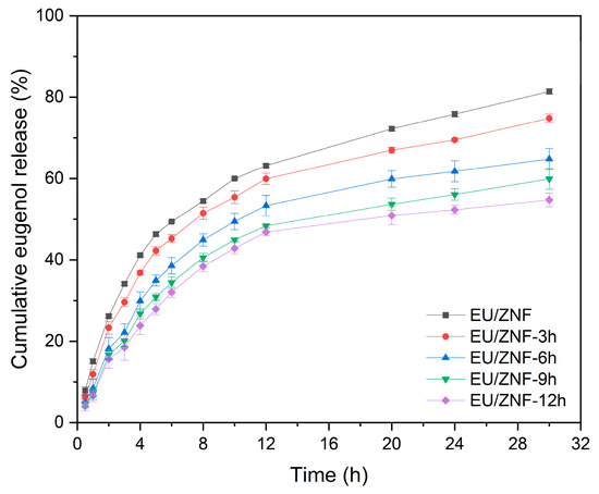 The release behavior of uncrosslinked and crosslinked zein nanofibers was then determined in PBS at 25 °C. According to Figure 8, all nanofiber samples exhibited a similar trend of EU release, comprising a burst release in the initial 2 h, followed by a sustained release up to 30 h. The initial release percentage for EU/ZNF was 26.15 ± 0.41%. The crosslinked zein nanofibers showed a decreased release percentage, with values of 23.31 ± 1.60% (EU/ZNF_3h), 18.15 ± 2.76% (EU/ZNF_6h), 16.66 ± 0.89% (EU/ZNF_9h), and 15.58 ± 2.23% (EU/ZNF_12h). At 30 h of release, approximately 81.38 ± 0.71% of release occurred from EU/ZNF. For EU/ZNF_3h, EU/ZNF_6h, EU/ZNF_9h, and EU/ZNF_12h, the cumulative release percentages were 74.80 ± 1.03%, 64.79 ± 2.58%, 59.89 ± 2.55%, and 54.74 ± 1.66% at 30 h, respectively. The initial burst release is possibly due to the rapid dissolution of EU close to the fiber surface, and the subsequent gradual release mostly depends on the diffusion rate of EU inside the fibers to the surface [33]. These results indicate that crosslinking post-treatment by GTA vapors could restrict molecular movement, ultimately extending the release time of EU from the zein nanofibers [67]. Furthermore, crosslinking reduced the number of 3D porous structures, which could restrict the permeation of water molecules, making it more difficult to release EU from crosslinked nanofibers [35]. Similarly, previous studies have reported that crosslinking treatment may prolong drug release from nanofibers [68,69]. Notably, the release rate of EU significantly decreased with the crosslinking time increasing to 6 h. Subsequently, a slower decline in the EU release rate was observed until 12 h of crosslinking. This decrease could be due to sufficient crosslinking after 6 h of the crosslinking reaction, resulting in a decline in the sustained release effect with the crosslinking time up to 12 h.