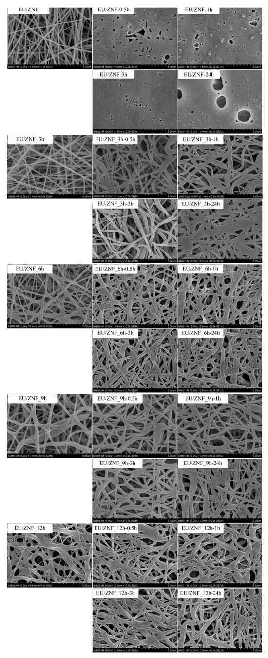 It has been demonstrated that fiber morphology can influence the drug-release behavior of electrospun nanofibers [70,71]. To better understand the release behavior of EU from crosslinked zein nanofibers by GTA vapors, the morphology of the nanofibers was observed after immersion in PBS (pH = 7.2) for 24 h. As shown in Figure 9, neat zein nanofibers exhibited poor stability in PBS, as EU/ZNF collapsed into a film after 0.5 h of immersion in PBS, likely due to the high hydrophobicity of the zein nanofibers. When the nanofibers were immersed in PBS, strong hydrophobic interactions between the fibers caused the formation of film-like substances [67]. The crosslinked zein nanofibers maintained their fiber shape and 3D porous structure in PBS after immersion for 24 h, although a certain extent of swelling of the fibers was observed. By increasing the crosslinking time up to 12 h, the stability of the nanofibers increased, which corresponds to the decrease in their volume shrinkage observed in Figure 5. This increased stability could be ascribed to the robust fiber matrix resulting from the formation of chemical bonds during crosslinking, resulting in their sustained-release performance. Similarly, Luo et al. (2018) fabricated gelation nanofibers crosslinked by GTA, which showed good stability in PBS [67]. In the study by Chen et al. (2022), improved water stability of feather keratin/gelatin nanofibers after vapor-phase GTA crosslinking was also observed [31].