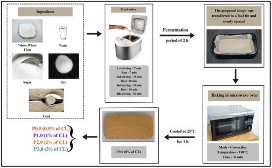 WWB samples containing varying CL concentrations, ranging from 0%, 0.5%, 1%, 2%, and 3%, were prepared. The samples were denoted as P0.0 (control; 0% w/w of CL), P0.5 (0.5% w/w of CL), P1.0 (1% w/w of CL), P2.0 (2% w/w of CL), and P3.0 (3% w/w of CL). The components listed in (Table 1) were mixed and placed inside the baking pan of the breadmaking machine (Make: Kent RO Systems Ltd., Noida, India), which was set to the “whole wheat bread” program, which started with a heating period of 5 min. Then, the mixture underwent a simultaneous kneading and resting process within the machine for 1 h, followed by a 2 h fermentation period at 30 °C. After fermentation, the dough was transferred to a loaf tin and evenly spread across the surface using a bread spreader. Subsequently, the loaf tin was placed inside a microwave oven preheated for 5 min at 180 °C. The dough was then baked at 180 °C for a total duration of 36 min. After the baking process, the prepared WWBs were cooled for 1 h at room temperature (25 °C).