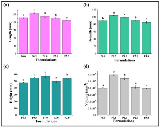 Physical dimensions of whole wheat bread (WWB) formulations containing chitosan lactate (CL) in different concentrations: P0.0 (control, absence of CL), P0.5, P1.0. P2.0, and P3.0 (0.5%, 1.0%, 2.0%, and 3.0% of CL). (a) Length, (b) breadth, (c) height, and (d) volume. The values denoted in the graphs are the average ± SD of triplicate samples. Bars with different letters differ significantly (p < 0.05).
