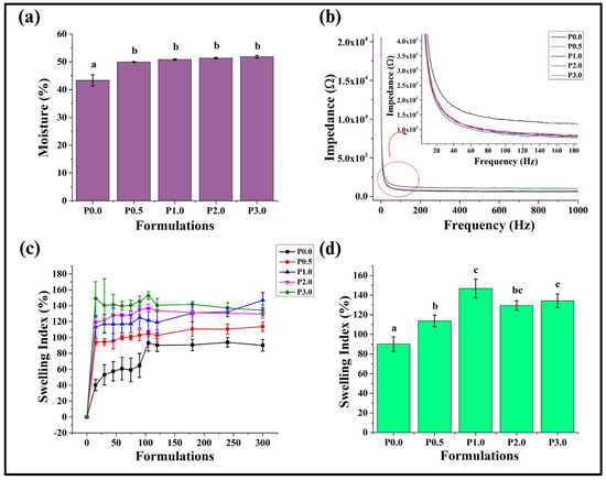 Graph representing: (a) moisture content, (b) impedance analysis (the red dotted circle represents the area magnified), (c) swelling index (%) of whole wheat bread (WWB) formulations, (d) swelling index (%) of WWB formulations at the end of the study (5 h). WWB formulations containing chitosan lactate (CL) in different concentrations: P0.0 (control, absence of CL), P0.5, P1.0, P2.0, and P3.0 (0.5%, 1.0%, 2.0%, and 3.0% of CL). The values denoted in the graphs are the average ± SD of triplicate samples. Bars with different letters differ significantly (p < 0.05).