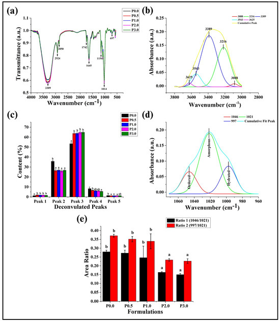 (a) Fourier Transform Infrared Spectroscopy (FTIR) spectra of whole wheat bread (WWB) formulations, (b) Deconvulated bands of the water region (3800 to 3000 cm−1) of WWB formulations, (c) Bar graph representing the area under the curve (AUC) of the peaks found in the water region, (d) Deconvulated bands of the starch fingerprint region (1070–950 cm−1), and (e) Bar graph representing the area ratio of the starch region in the WWB formulations. WWB formulations containing chitosan lactate (CL) in different concentrations: P0.0 (control, absence of CL), P0.5, P1.0, P2.0, and P3.0 (0.5%, 1.0%, 2.0%, and 3.0% of CL). The values denoted in the graphs are the average ± SD of triplicate samples. Bars with different letters differ significantly (p < 0.05).