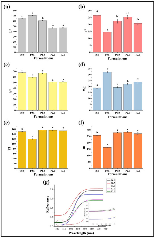 Graphs representing the colorimetric analysis of whole wheat bread (WWB) formulations: (a) L*, (b) (c) b*, (d) WI, (e) YI, (f) BI, of WWB formulations. (g) Line graph representing the reflectance of WWB samples against the visible spectrum (the red dotted circle represents the area magnified). WWB formulations containing chitosan lactate (CL) in different concentrations: P0.0 (control, absence of CL), P0.5, P1.0, P2.0, and P3.0 (0.5%, 1.0%, 2.0%, and 3.0% of CL). The values denoted in the graphs are the average ± SD of triplicate samples. Bars with different letters differ significantly (p < 0.05).