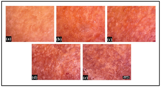 The surface topology of the crust of whole wheat bread (WWB) formulations. WWB formulations containing chitosan lactate (CL) in different concentrations: P0.0 (control, absence of CL), P0.5, P1.0, P2.0, and P3.0 (0.5%, 1.0%, 2.0%, and 3.0% of CL). (a) P0.0, (b) P0.5, (c) P1.0, (d) P2.0, (e) P3.0. Scale bar: 1000 μm—the same magnification for all images.