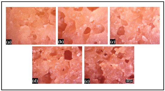 The surface topology of the crumb of whole wheat bread (WWB) formulations. WWB formulations containing chitosan lactate (CL) in different concentrations: P0.0 (control, absence of CL), P0.5, P1.0, P2.0, and P3.0. (a) P0.0, (b) P0.5, (c) P1.0, (d) P2.0, (e) P3.0 (0.5%, 1.0%, 2.0%, and 3.0% of CL). Scale bar: 1000 μm—the same magnification for all images.
