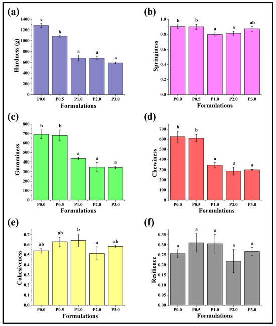 Bar graphs representing texture profile analysis (TPA) of whole wheat bread (WWB) formulations: (a) hardness, (b) springiness, (c) gumminess, (d) chewiness, (e) cohesiveness, and (f) resilience. WWB formulations containing chitosan lactate (CL) in different concentrations: P0.0 (control, absence of CL), P0.5, P1.0, P2.0, and P3.0 (0.5%, 1.0%, 2.0%, and 3.0% of CL). The values denoted in the graphs are the average ± SD of triplicate samples. Bars with different letters differ significantly (p < 0.05).