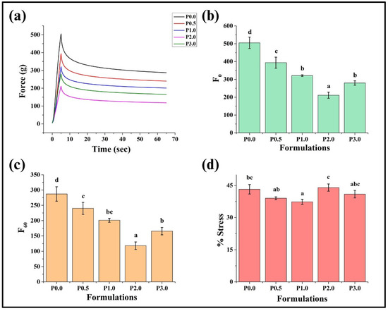 Bar graphs representing: (a) stress relaxation profile of whole wheat bread (WWB) formulations and its parameters (b) F0, (c) F60, and (d) % stress. WWB formulations containing chitosan lactate (CL) in different concentrations: P0.0 (control, absence of CL), P0.5, P1.0, P2.0, and P3.0 (0.5%, 1.0%, 2.0%, and 3.0% of CL). The values denoted in the graphs are the average ± SD of triplicate samples. Bars with different letters differ significantly (p < 0.05).