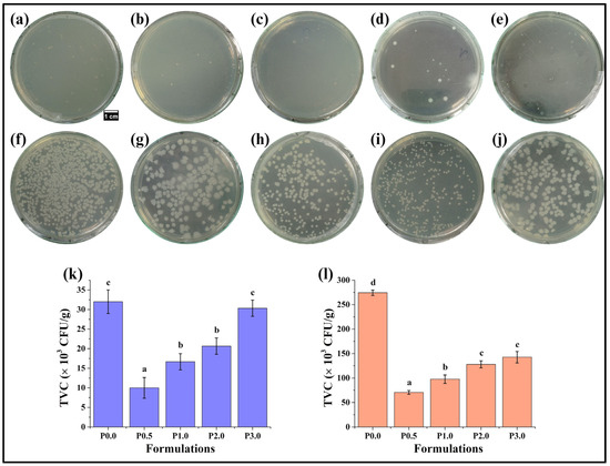 The number of colonies on day 0 of storage of whole wheat bread (WWB): (a) P0.0, (b) P0.5, (c) P1.0, (d) P2.0, and (e) P3.0. The number of colonies on 2nd day of storage: (f) P0.0, (g) P0.5, (h) P1.0, (i) P2.0, and (j) P3.0 (diameter of Petri plates = 8.5 cm), and bar graphs representing total plate count (×103 CFU/g) of WWB formulations: (k) on day 0 of storage and (l) on 2nd day of storage. WWB formulations containing chitosan lactate (CL) in different concentrations: P0.0 (control, absence of CL), P0.5, P1.0, P2.0, and P3.0 (0.5%, 1.0%, 2.0%, and 3.0% of CL). The values denoted in the graphs are the average ± SD of triplicate samples. Bars with different letters differ significantly (p < 0.05).