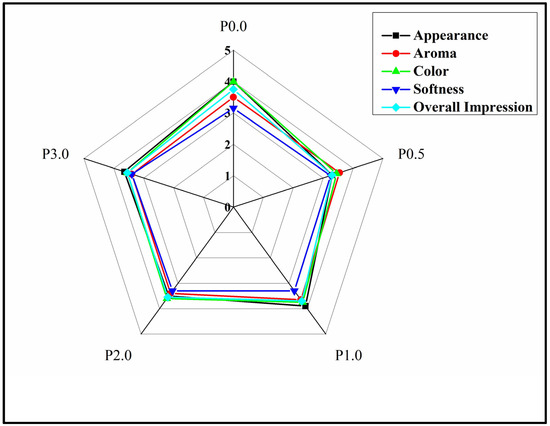 Overall, extremely hard bread is usually considered undesirable as it becomes difficult to consume and is often associated with poor quality and staling. In contrast, excessively soft bread may suggest incomplete development of the gluten network or a high moisture content, which can negatively impact the shelf life of bread. Bread with moderate firmness is usually preferable because it provides a balance between structural integrity and palatability [67]. Further, bread with higher gumminess, chewiness, and springiness values is often associated with enhanced textural properties and prolonged shelf life [68]. In our case, P0.5 fits completely with the above characteristics as it demonstrated moderate firmness and high springiness, gumminess, and chewiness values that correspond to improved textural properties and prolonged shelf life of the bread.