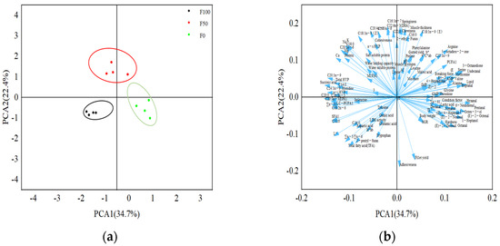 Principal component analysis (PCA) and cluster analysis of fillet quality parameters in the control (FO), 50% (F50) and 100% (F100) substitution groups. PCA and cluster analysis of the results from fish samples showing the first two principal components (PCA1 and PCA2). In the score plot (a), there are four pooled samples within each group, each sample was consisted of three fish (n = 4); In the correlation loading plot of the measured variables (b), there are 114 arrows and each arrow point to one quality variable (indicator).