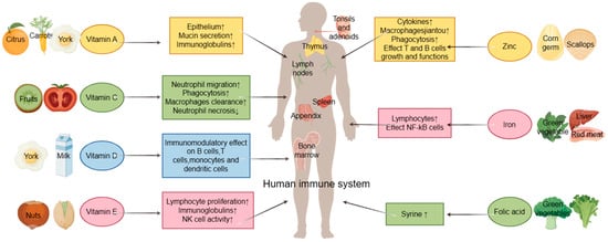 Boosting mechanisms on the immune system and representative food sources of critical micronutrients (By Figdraw; https://www.figdraw.com/#/; accessed on 23 January 2024).