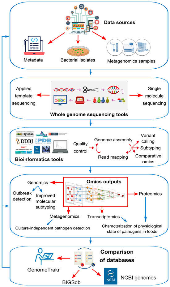 To guarantee hygienic and nutritionally beneficial food for human health, implementing new legislation accompanied by technological advancements is imperative [114]. One such advancement is utilizing high-performance omics techniques in food quality detection, encompassing genomics, transcriptomics, proteomics, and metabolomics. Particularly, whole genome sequencing (WGS) has revolutionized food safety by providing intricate genetic insights into pathogens and spoilage organisms (Figure 6). WGS facilitates rapid outbreak detection, precise source tracking, and targeted interventions, thus significantly enhancing food quality detection. Its widespread adoption by public health authorities and the food industry underscores its vital role in ensuring the production of safer food products [115]. The operational mechanism of WGS, as elucidated by scientific research [116], encompasses the following: