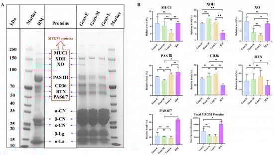 MFGM proteins, which constitute approximately 1–4% of the total protein in milk, are associated with MFG secretion and lipid synthesis, and their content varies across different species [9]. Hence, the difference in MFGM proteins between human and goat milk was determined based on protein gel electrophoresis (Figure 1A). All protein names were referenced according to the research conducted by Fontecha et al. [32].