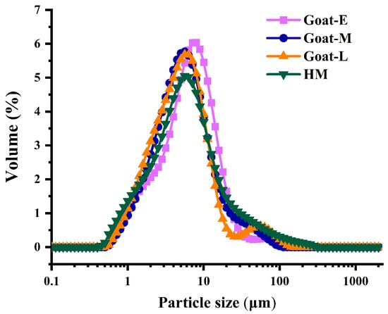 The results revealed that HM exhibited the smallest particle size (4.70 μm), while Goat-E displayed the largest particle size (6.03 μm). Goat-M (5.17 μm) and Goat-L (5.31 μm) demonstrated comparable particle sizes, aligning with earlier studies [41]. Similarly, it has been observed that as lactation progresses through different stages of goat milk production, the size of MFGs decreases [9]. The variation in MFG size observed at different stages of lactation may be attributed to the mother’s optimization of maternal energy and the provision of the required nutrients and bioactive components to maximize infant survival [42]. Notably, the Goat-M and Goat-L samples were identified, but all the samples had no statistical difference in particle size, possibly related to the stability of the lipid–protein ratio, indicating that the secretion of proteins and lipids is in equilibrium [9]. This phenomenon was consistent with the relative changes in membrane protein content (Figure 1B). Furthermore, the elevated levels of glycosylated proteins (MUC1, BTN, and XDH) in the MFGM may contribute to the resistance of MFGs against gastrointestinal digestion [9]. Smaller MFGs contain a higher proportion of easily digestible glycosylated proteins than larger MFGs [38]. Although human milk had smaller MFG sizes, its total amount of glycosylated proteins was lower than goat colostrum. Unfortunately, there are currently no clear comparative results on the extent to which MFG size and glycosylated protein content affect MFG digestion.