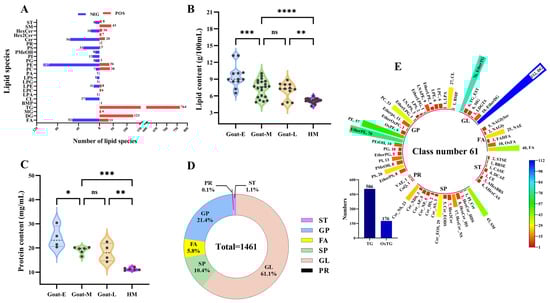 Lipid molecule composition in goat milk and human milk: (A) the number of lipid molecules identified in the positive (POS) and negative (NEG) ion modes; (B) the lipid content and (C) protein content of goat milk and human milk; and (D) the number of lipid categories and (E) the number of lipid subclasses in goat milk and human milk. Note: for abbreviations, see Supplementary Materials (Table S4—Abbreviations). * is p < 0.05, ** is p < 0.01, *** is p < 0.001, **** is p < 0.0001, “ns” is no significant.