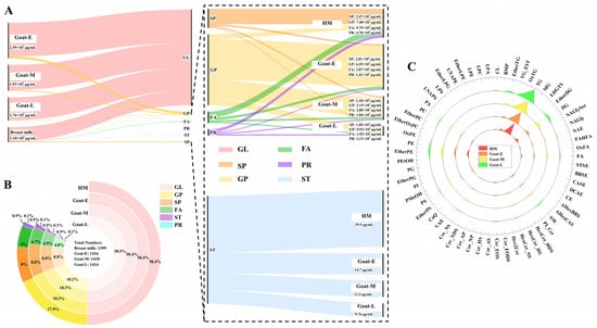 We further explored the changes in the lipid composition of goat milk during different lactations and human milk. As depicted in the Sankey diagram in Figure 4A, GLs with the largest percentage of content decreased with lactation, with human milk having only 17.5% of goat colostrum’s amount, which was consistent with changes in the crude fat content. The results for other lipids (right side of Figure 4A) showed that SPs tended to decrease across goat lactations but were highest in human milk, reaching up to 2.47 mg/mL, which was 8.8 times higher than colostrum levels. GPs generally decreased throughout lactation, reaching a final level seven times lower than that of colostrum at 0.99 mg/mL for mature milk, yet human milk only reached 74.5% of this level by that time. Interestingly, FAs, PRs, and STs showed a decreasing trend among human milk and different lactations, with STs being the least abundant of these lipids at less than 10%. The amount of each lipid category in each group is identified in the lower right corner of the figures. To our knowledge, this study provides the most comprehensive description yet of the differences between human milk and goat milk regarding their lipid profiles across various stages, including content and categories. Although Zhang et al. [41] studied the surface structure and lipid distribution of goat MFGs during different lactations, only 386 glycerides and 10 phospholipids were identified. Thus, the present study complements their findings.