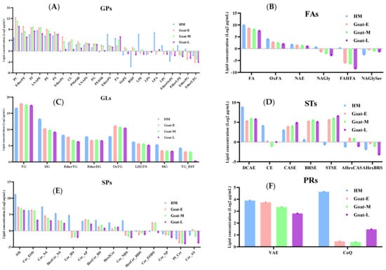 The content of lipid classes for GPs (A), FAs (B), GLs (C), STs (D), SPs (E), and PRs (F) in goat milk and human milk. Note: for abbreviations, see Supplementary Materials (Table S4—Abbreviations).