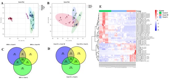 (A) Score plot and loading plot of PCA based on goat milk during different lactations and human milk, (B) score plot and loading plot of PCA based on goat milk during different lactations, (C) content heat map of common differential lipid molecules in the human milk versus goat milk comparison groups and (D) the goat milk during different lactations comparison group, and heat map of differential lipid molecules in the (E) goat milk during different lactations comparison group.
